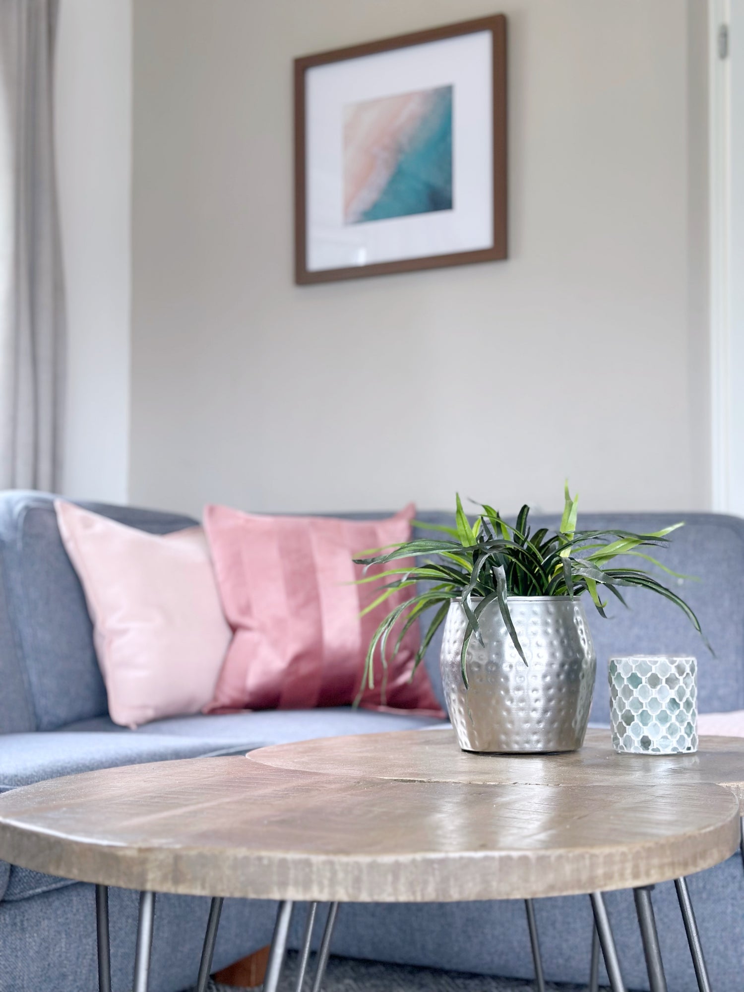 Een nieuwe, frisse kleur op de muur in combinatie met andere kunst geeft de ruimte een warme sfeer. Lichte kussens en kleed maken het plaatje af.